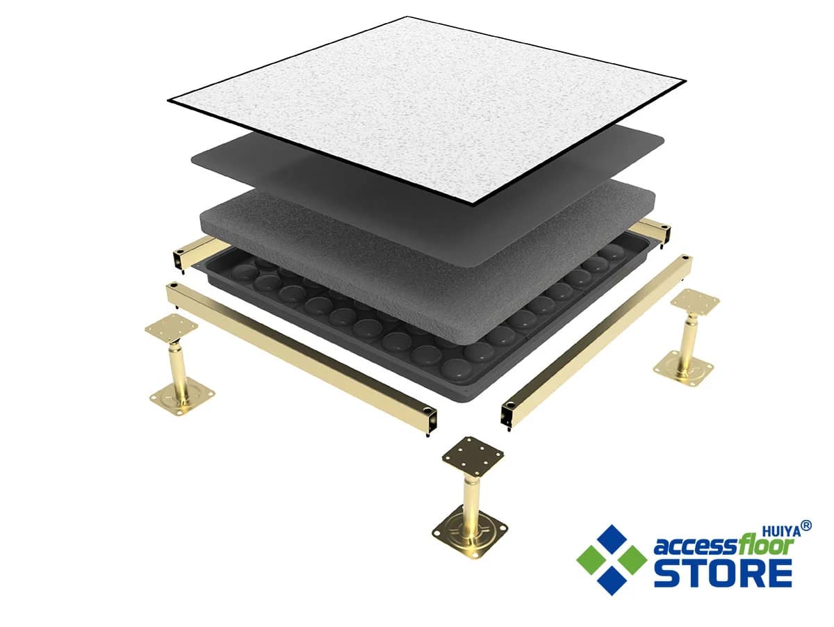 Modular panels typically sized 600×600 mm provide the walking surface and can be finished with materials such as HPL, carpet, or vinyl.